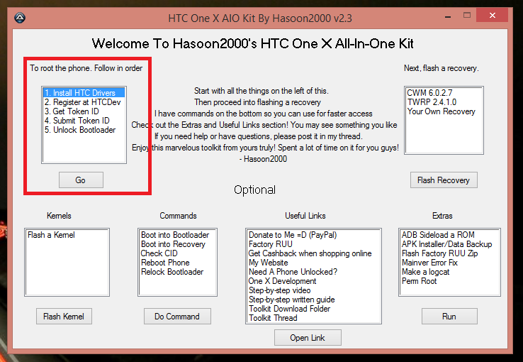 So nun das davor ausgepackte Programm starten („One X.exe“) und Punkt für Punkt durchgehen. Punkt 1 („Install HTC Drivers“ kann übersprungen werden da wir dieses vorab durchgeführt haben (Grund hierfür ist das ich Windows 8.1 habe und das Tool dort dieses nicht installieren kann.))